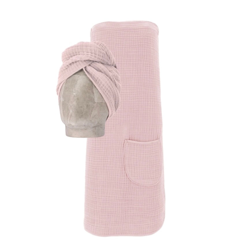 This muslin fabric spa set is perfect for home or when travelling. Muslin is not only light and breathable, but also quick-drying and soft and gentle on the body and hair. This high quality cotton is super absorbent. The sauna wrap has flexible press studs, adaptable to any figure and has a pocket to store your phone or lip chap! The matching hair towel is easy to secure with a button fastening. Each set is gift boxed.